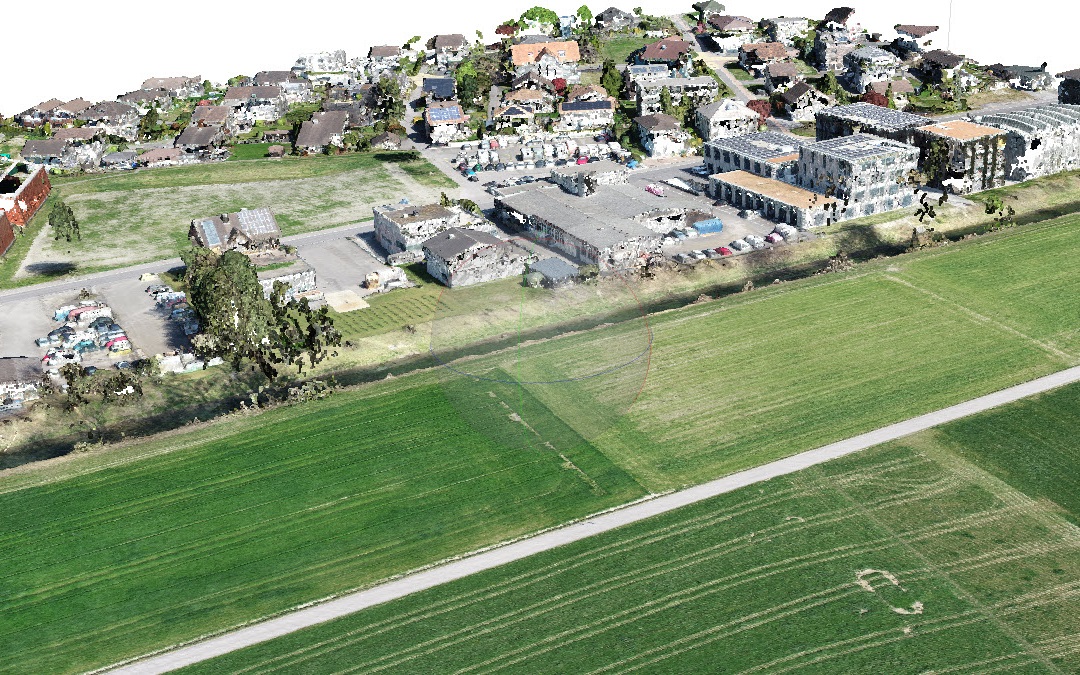 Umfang | Durchführung Drohnenflug zur Erstellung eines digitalen Geländemodells und eines hochauflösenden Orthofotos. Ergänzung und Verfeinerung des Datensatzes swissBUILDINGS3D mittels berechneter 3D-Punktwolke zur Erzeugung eines Gebäudemodells (LOD200) für den Modellbauer. |